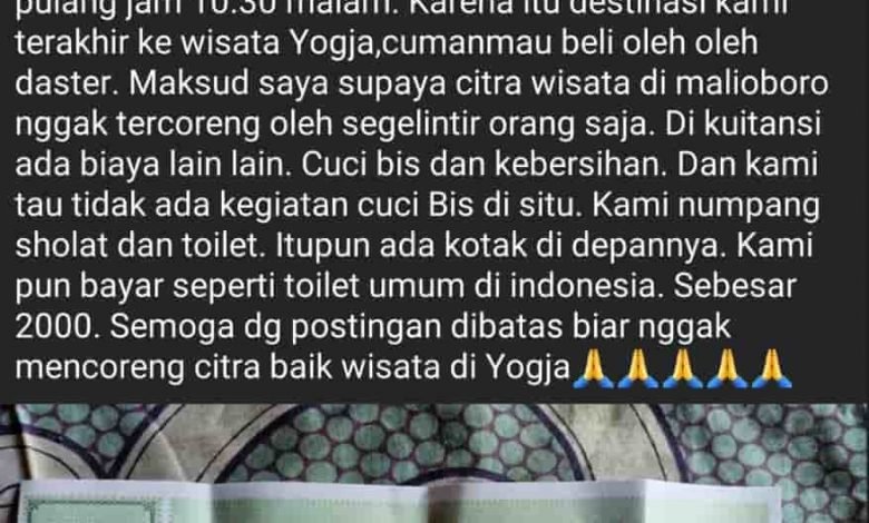 “Sekitar 2 jam setengah kami datang jam 9 malam dan pulang jam 10.30 malam. Karena itu destinasi kami terakhir ke wisata Yogya,cuma mau beli oleh oleh daster. Maksud saya supaya citra wisata di malioboro nggak tercoreng oleh segelintir orang saja. Di kuitansi ada biaya lain lain. Cuci bus dan kebersihan. Dan kami tau tidak ada kegiatan cuci bus di situ. Kami numpang salat dan toilet. Itupun ada kotak di depannya. Kami pun bayar seperti toilet umum di indonesia. Sebesar 2000. Semoga dengan postingan dibatasi biar nggak mencoreng citra baik wisata di Yogya,” kata dia. (*)